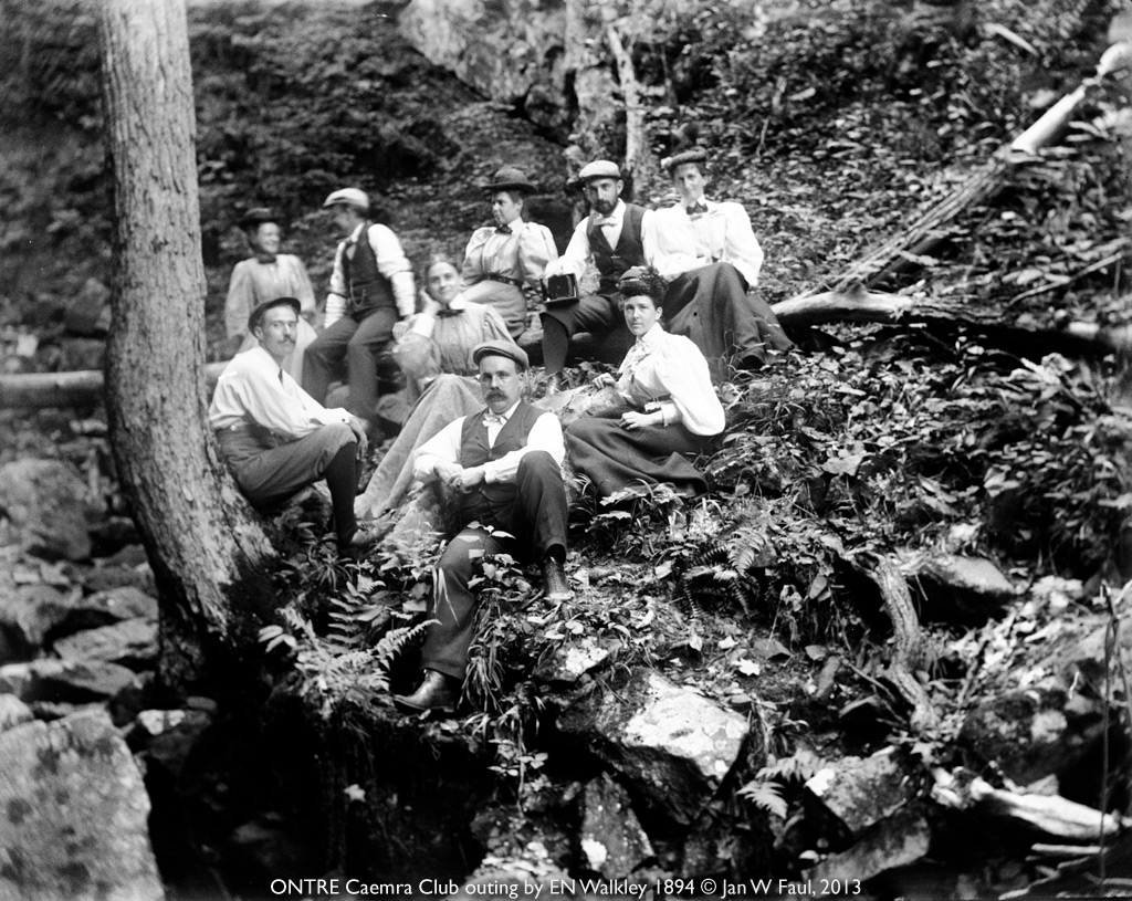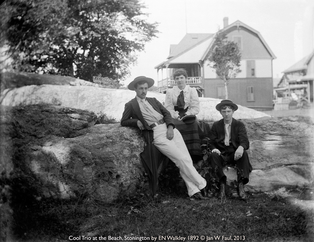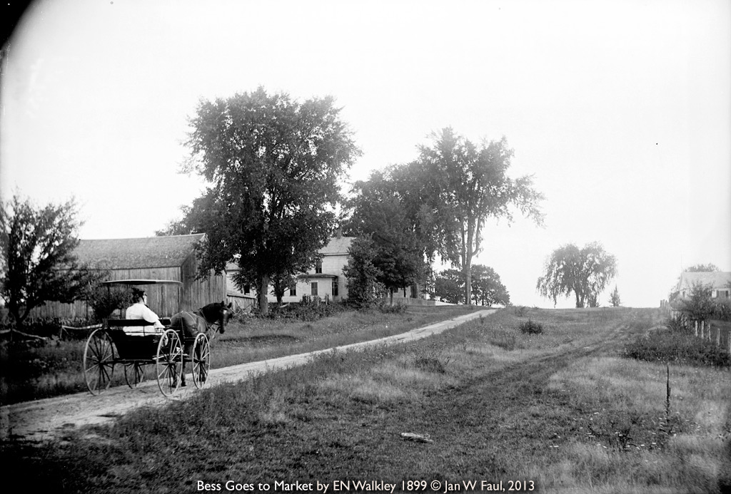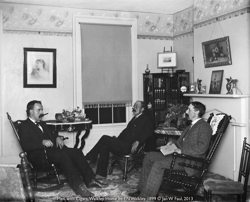 When I was 14, one of my aunts gave me a couple of boxes of mementos from her father Edwin N. Walkley, who had died in 1925. In the boxes were a few dozen card prints, some loose cellulose nitrate negatives from the early 20th century, about 50 Indian Head pennies, a blue GAR soldier’s reunion hat with reunion badges, roll of 45-starred US flags, wooden 4x5” field camera, and 545 4x5” and 5x8” glass plate negatives wrapped in yellowed newspapers.