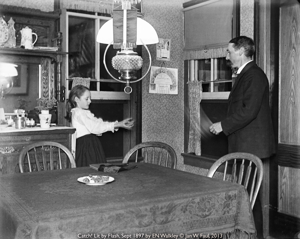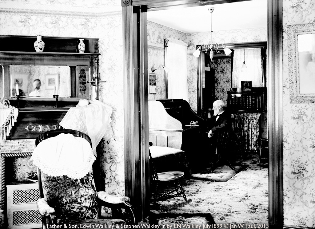 He spent what I can see was a great deal of time playing with light and time to display the passage of time in his life. There is an image of he and his father, the Civil War Veteran, sitting in the parlor and library. It is clearly a portrait of Stephen Walkley Jr. at his desk and it is a bit overexposed as he stands unassisted and blurry to perhaps show the passage of time. While his father sits in ¾ profile in the far room, he stands directly in front of a mirror over the mantle. Film was slow in the 1880’s and portraits were made of people leaning on a prop to keep their head steady and unmoving during the exposure. But ENW clearly stands without such a prop, as does his father sitting ten feet away. In a shot of his front hallway, both hands on the lock are in motion and the fireplace is lit with the diffuse light of many flames. The blurred hands show the exposure to have been five minutes.